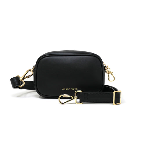 Anti-theft water-resistant Myko Crossbody in black with gold hardware with slash-resistant faux leather straps, front view