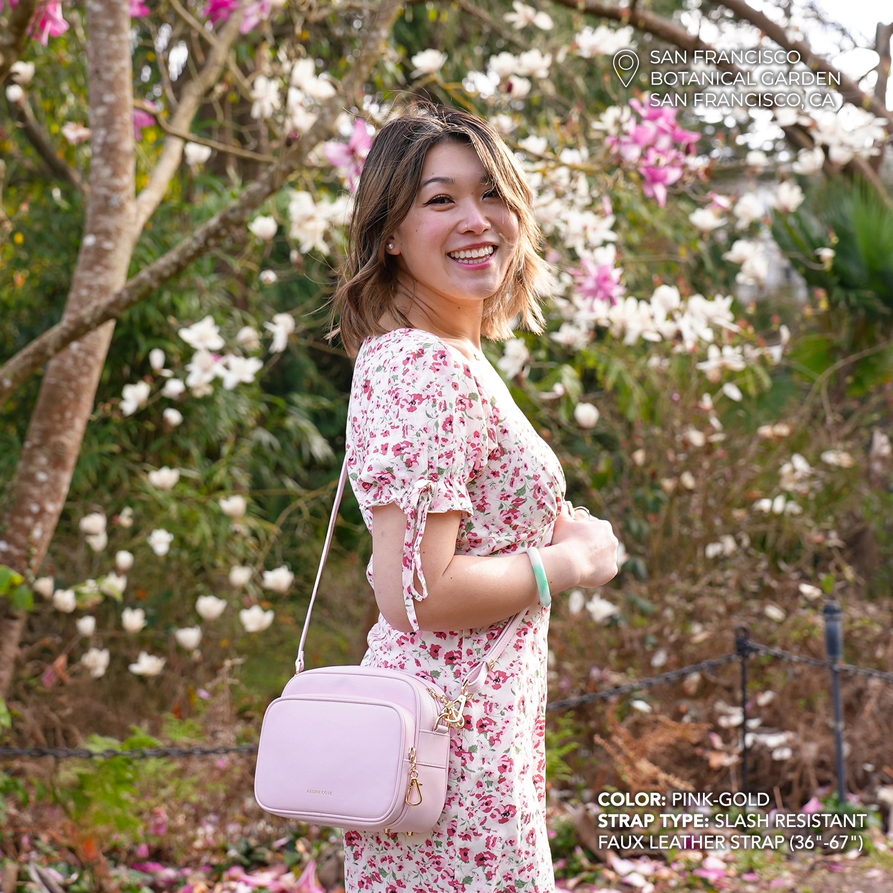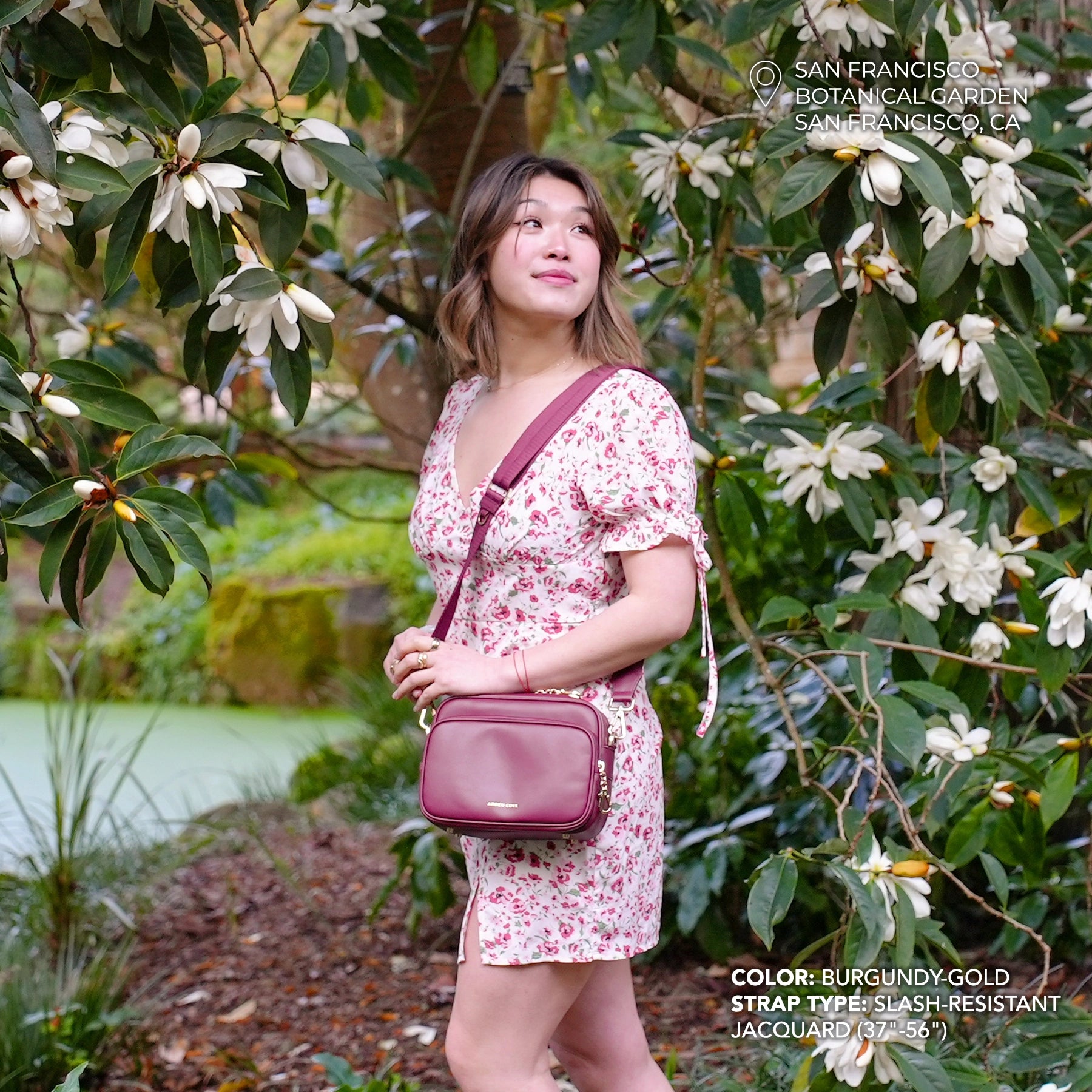 Woman wearing a floral dress with a black crossbody bag in an outdoor setting. Modeling the Verona Crossbody in black-gold with slash resistant faux leather strap