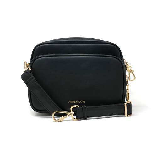 Verona Crossbody with wide slash resistant faux leather strap. Black faux leather handbag with gold accents front view