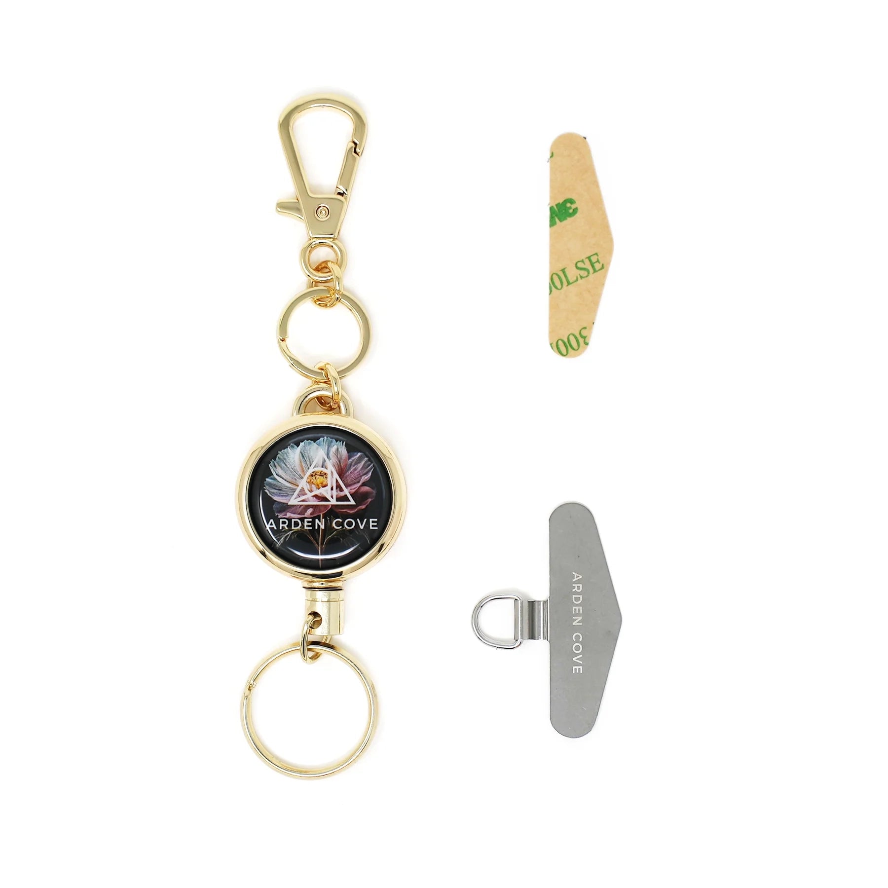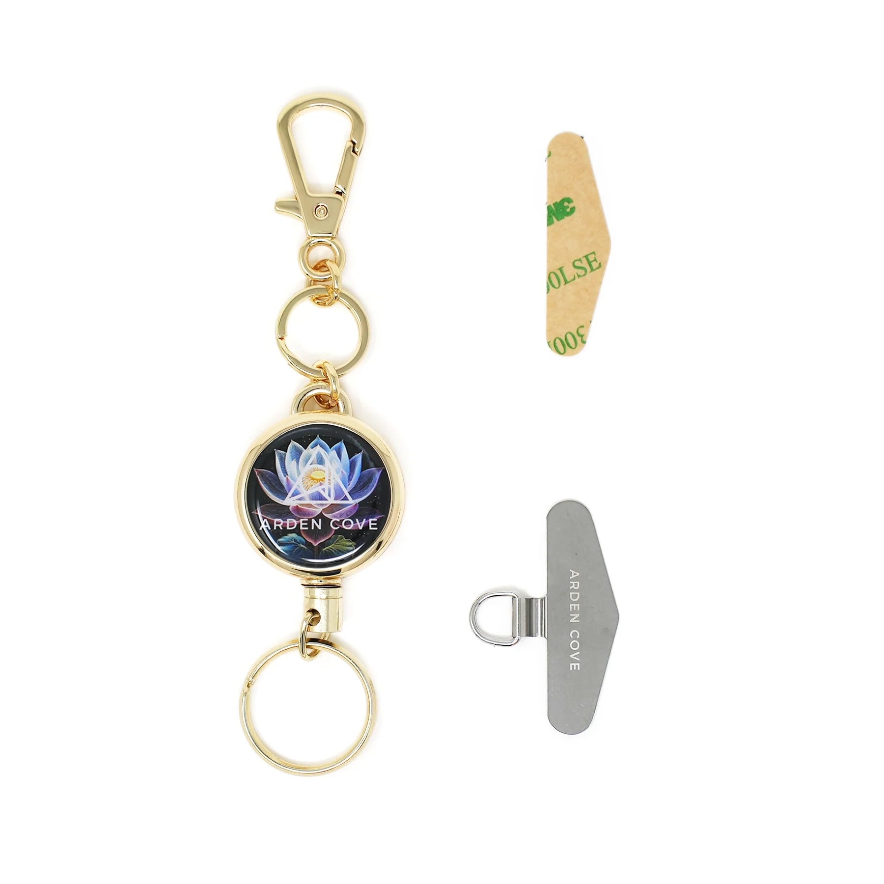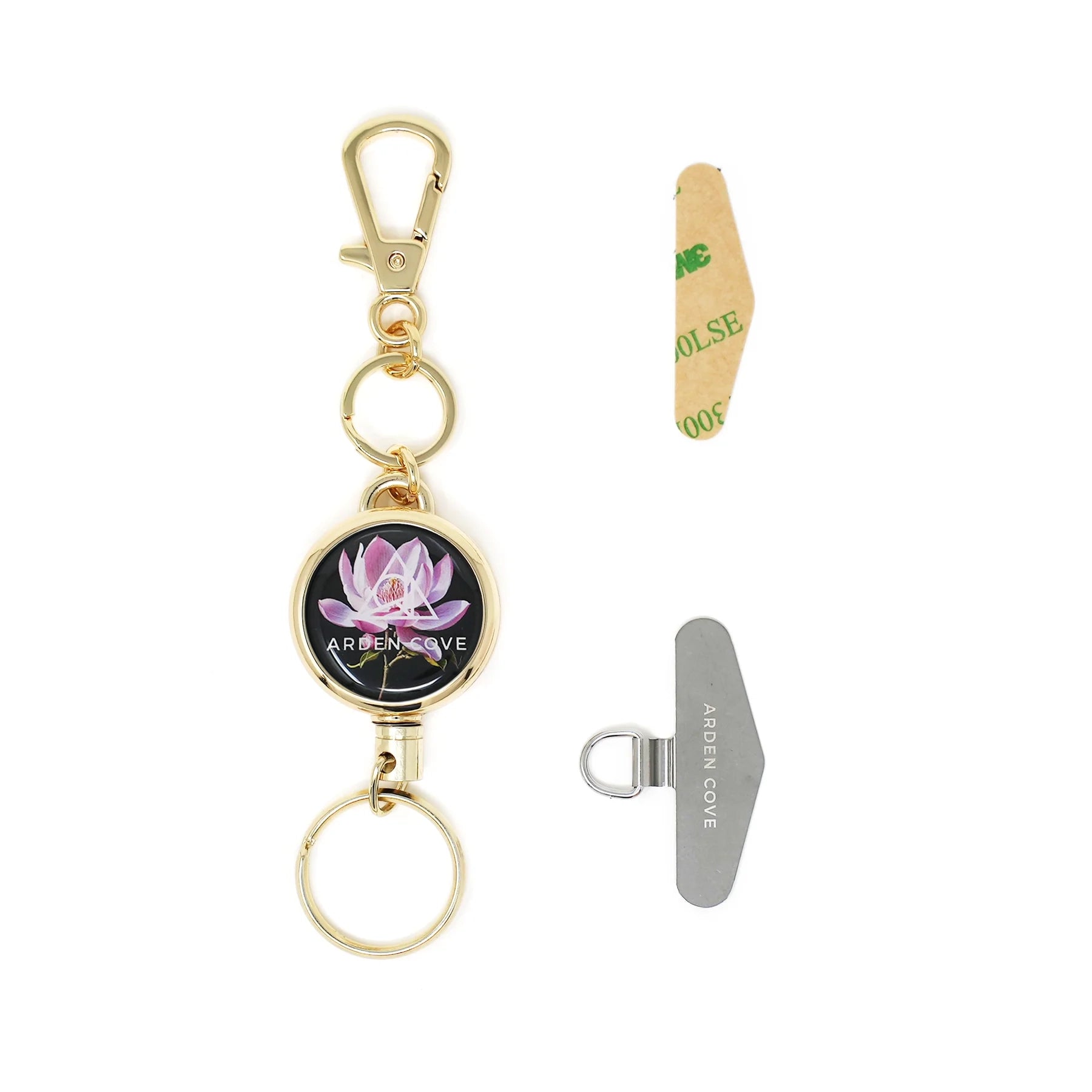 Anti-Theft Steel Cable Phone Tether in Gold with Lotus sticker, in metal housing and universal phone tab