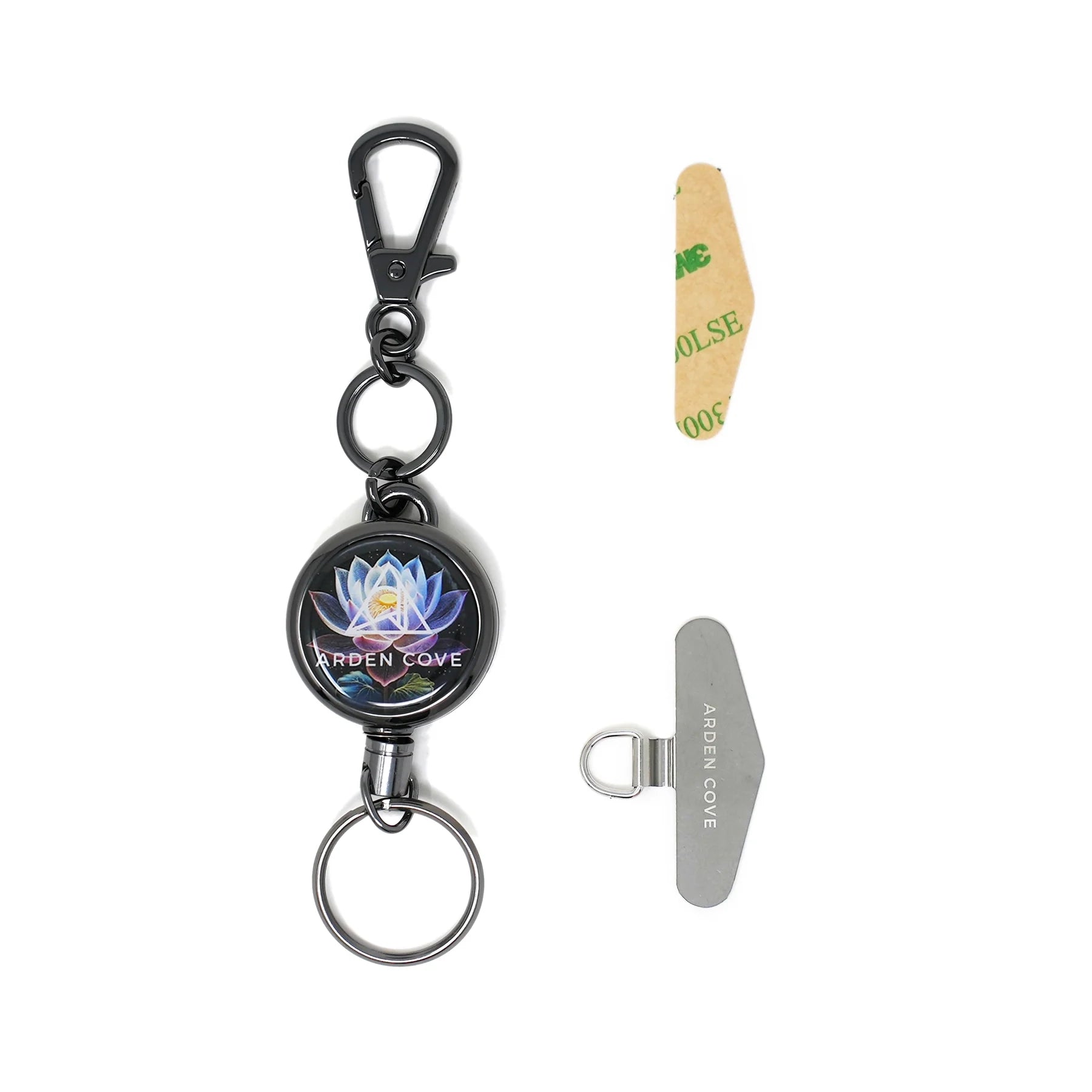 Anti-Theft Steel Cable Phone Tether in Gunmetal with Lotus sticker, in metal housing and universal phone tab