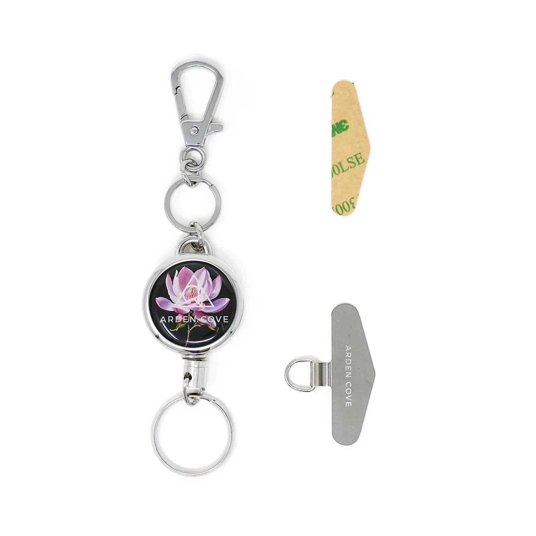 Anti-Theft Steel Cable Phone Tether in Silver with Lotus sticker, in metal housing and universal phone tab