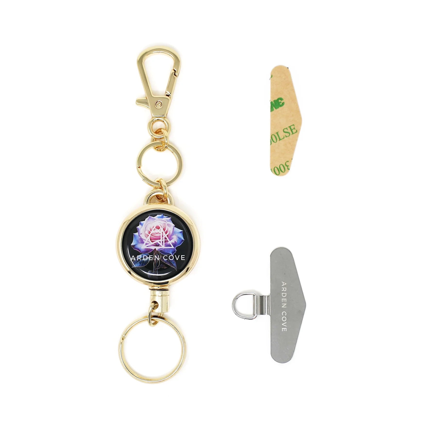 Anti-Theft Steel Cable Phone Tether in Gold with Rose sticker, in metal housing and universal phone tab