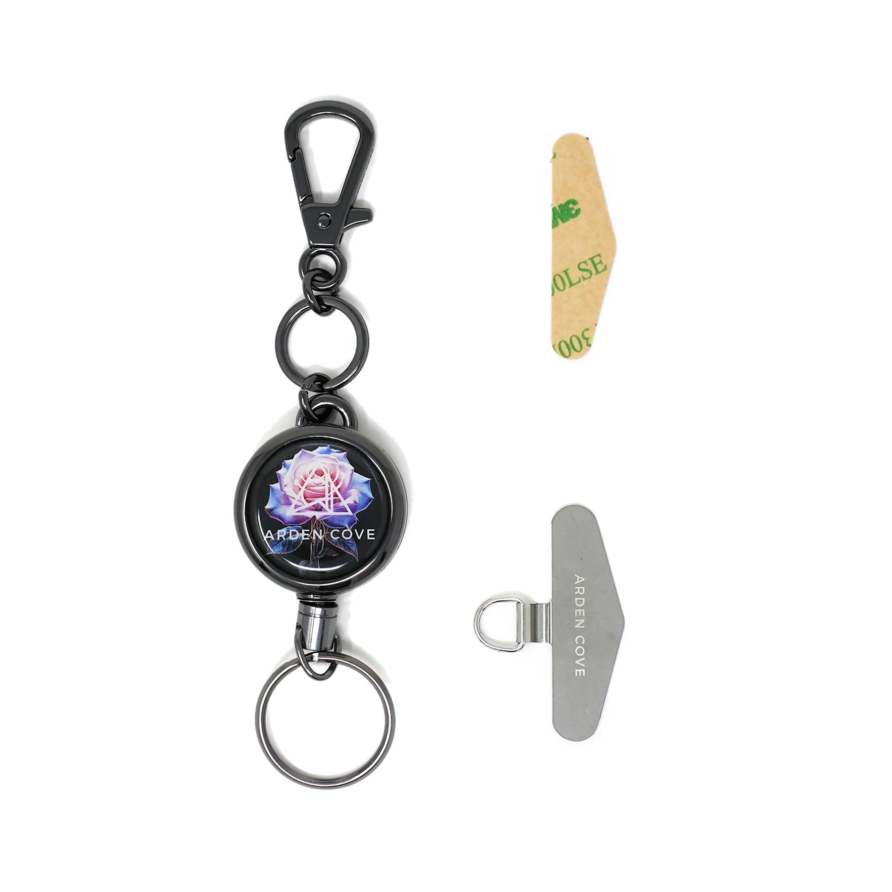 Anti-Theft Steel Cable Phone Tether in Gunmetal with Rose sticker, in metal housing and universal phone tab