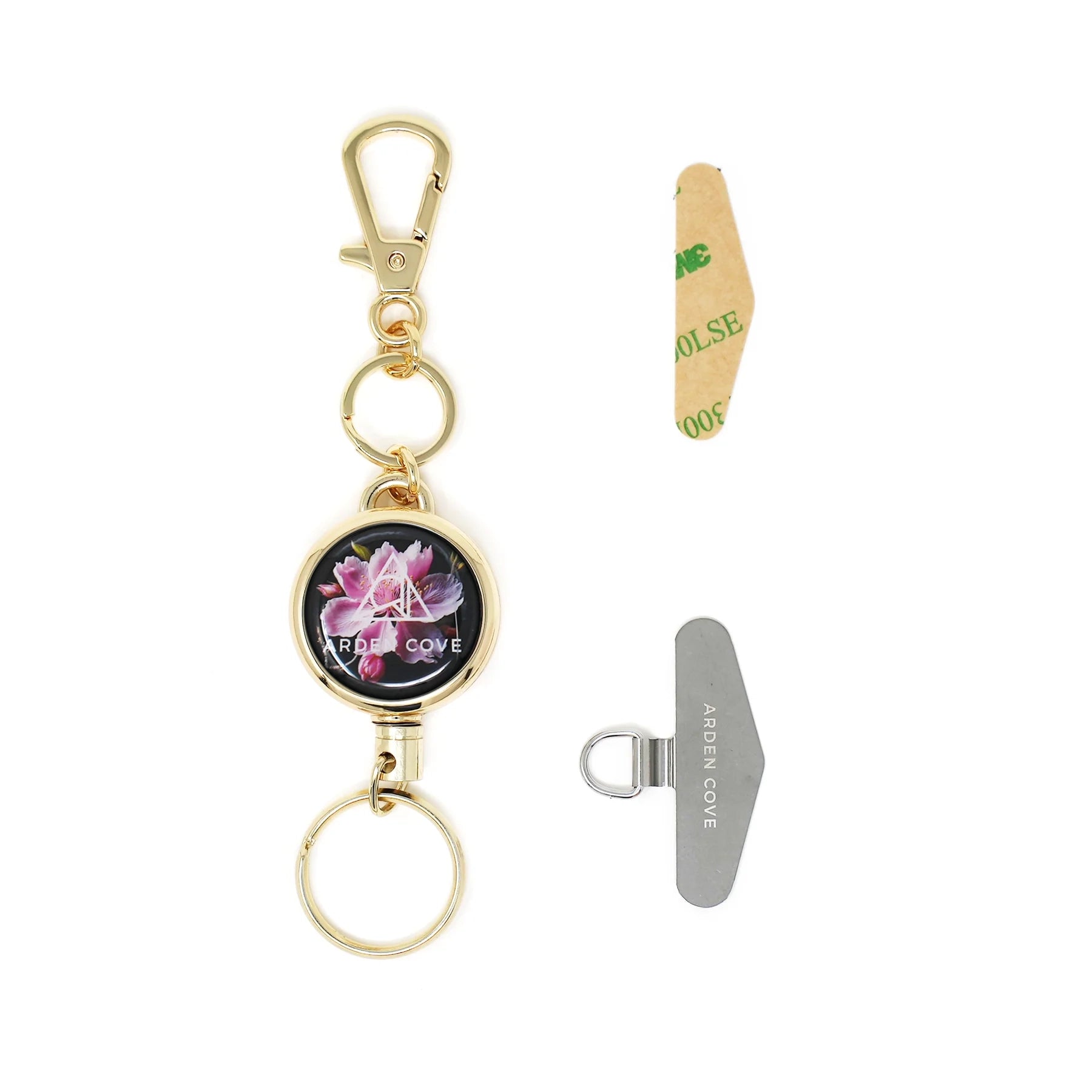 Anti-Theft Steel Cable Phone Tether in Gold with Cherry Blossom sticker, in metal housing and universal phone tab