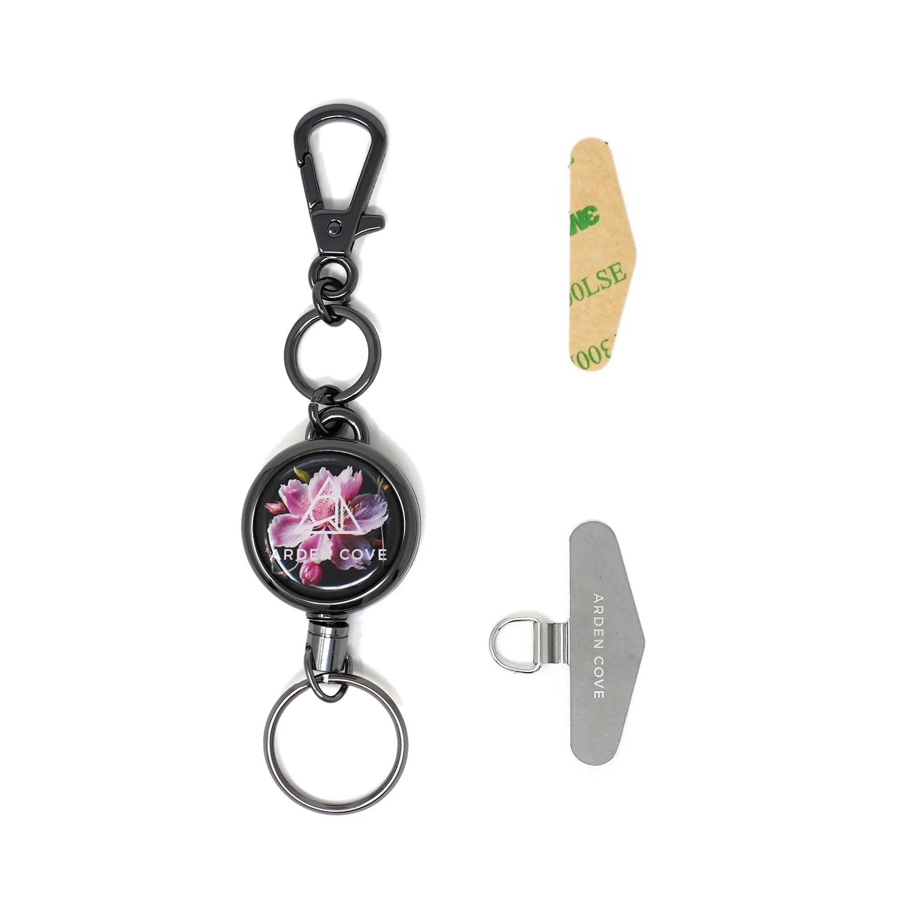 Anti-Theft Steel Cable Phone Tether in Gunmetal with Cherry Blossom sticker, in metal housing and universal phone tab